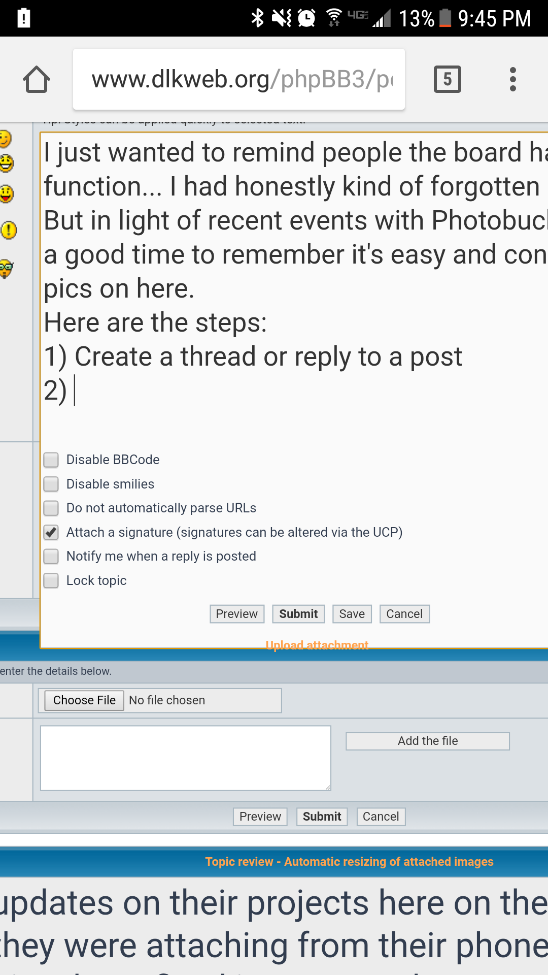 I just wanted to remind people the board has this function (uploading and auto resizing of full size pics)... I had honestly kind of forgotten about it myself. But in light of recent events with Photobucket, seems like a good time to remember it's easy and convenient to host and post pics on here.