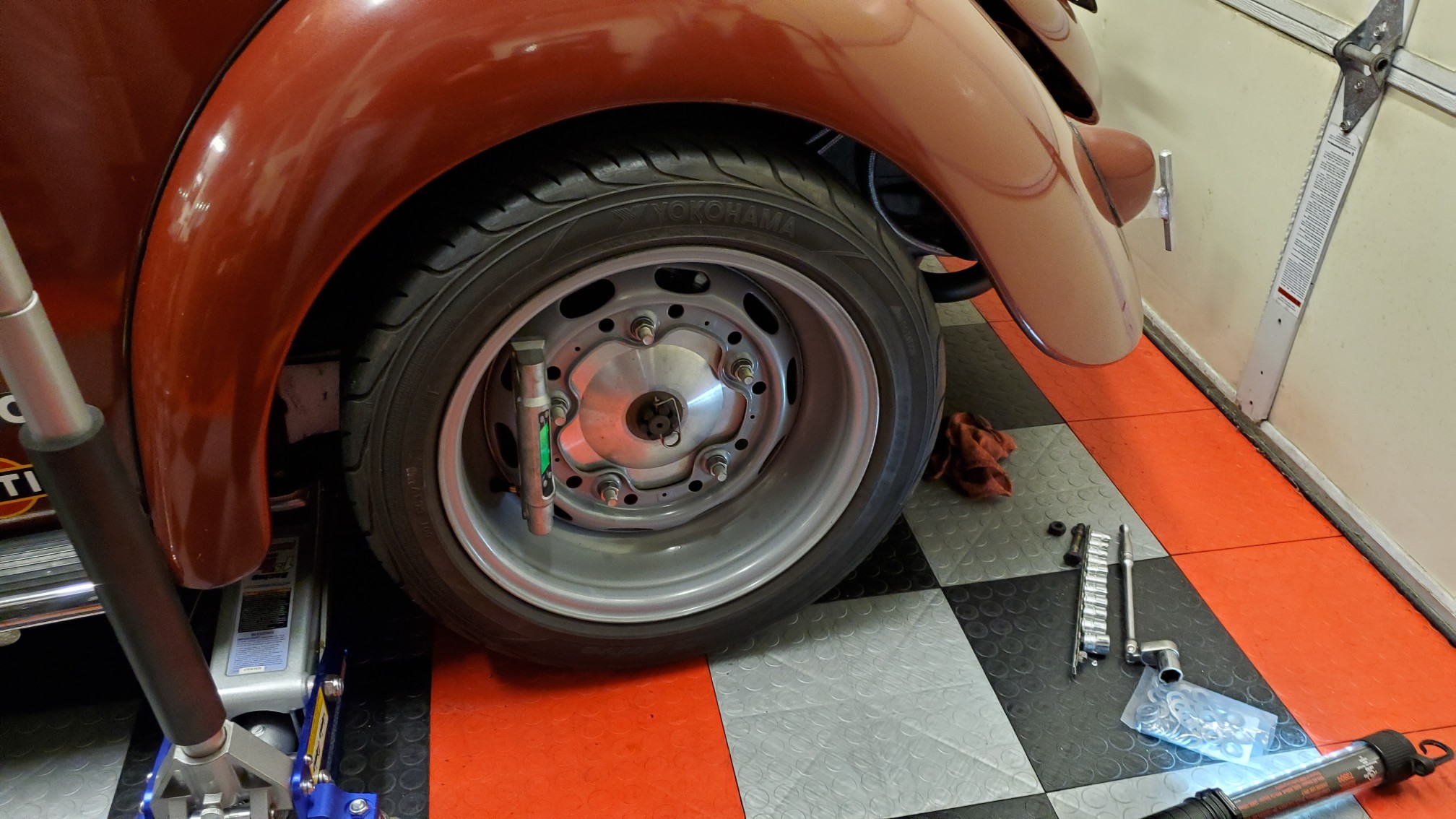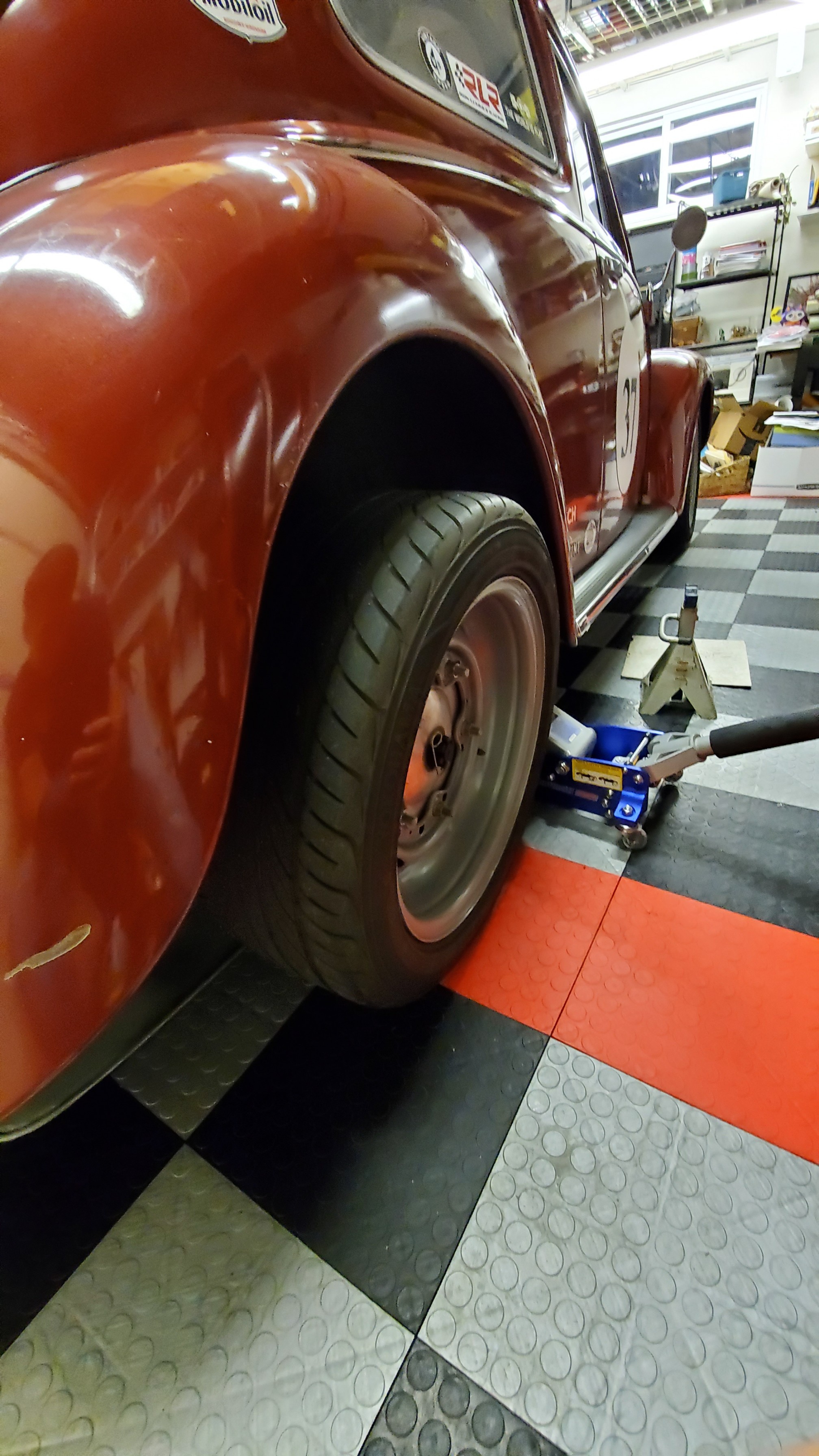 And finally, last night I finally put on the front sway bar I had bought many years ago for the car. It's made for a 2-3" narrowed beam, and mine is 4" narrow. I had to cut about 1/2" off each end to compensate for the narrower beam. It was a huge PITA to install, those t-bolt clamps really don't want to conform around everything. Many a 4-letter word later and I finally got it on. Swing axle cars have very high rear roll resistance, so the front bar should really balance the car by adding front roll resistance.