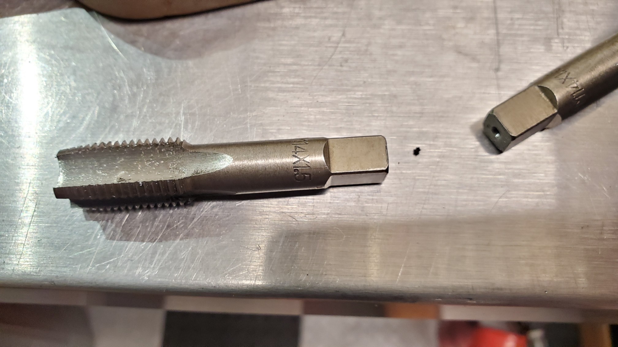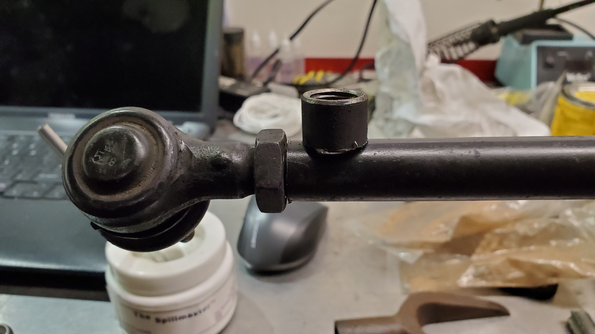Tapped it far enough that I could bottom out the tierod end. That's the piece I cut off sitting on it.