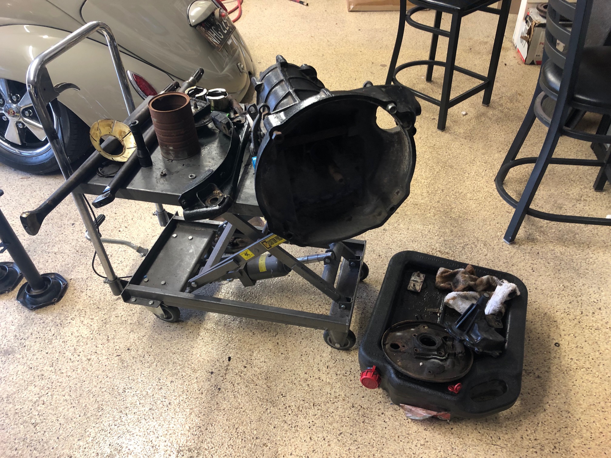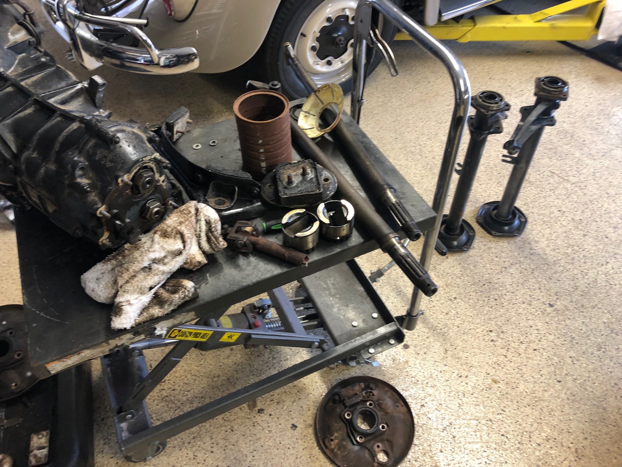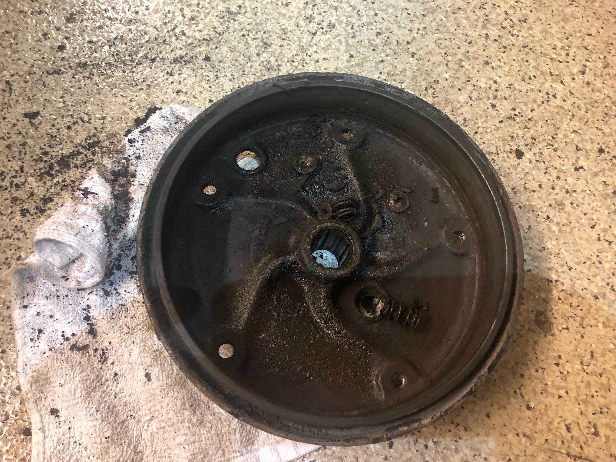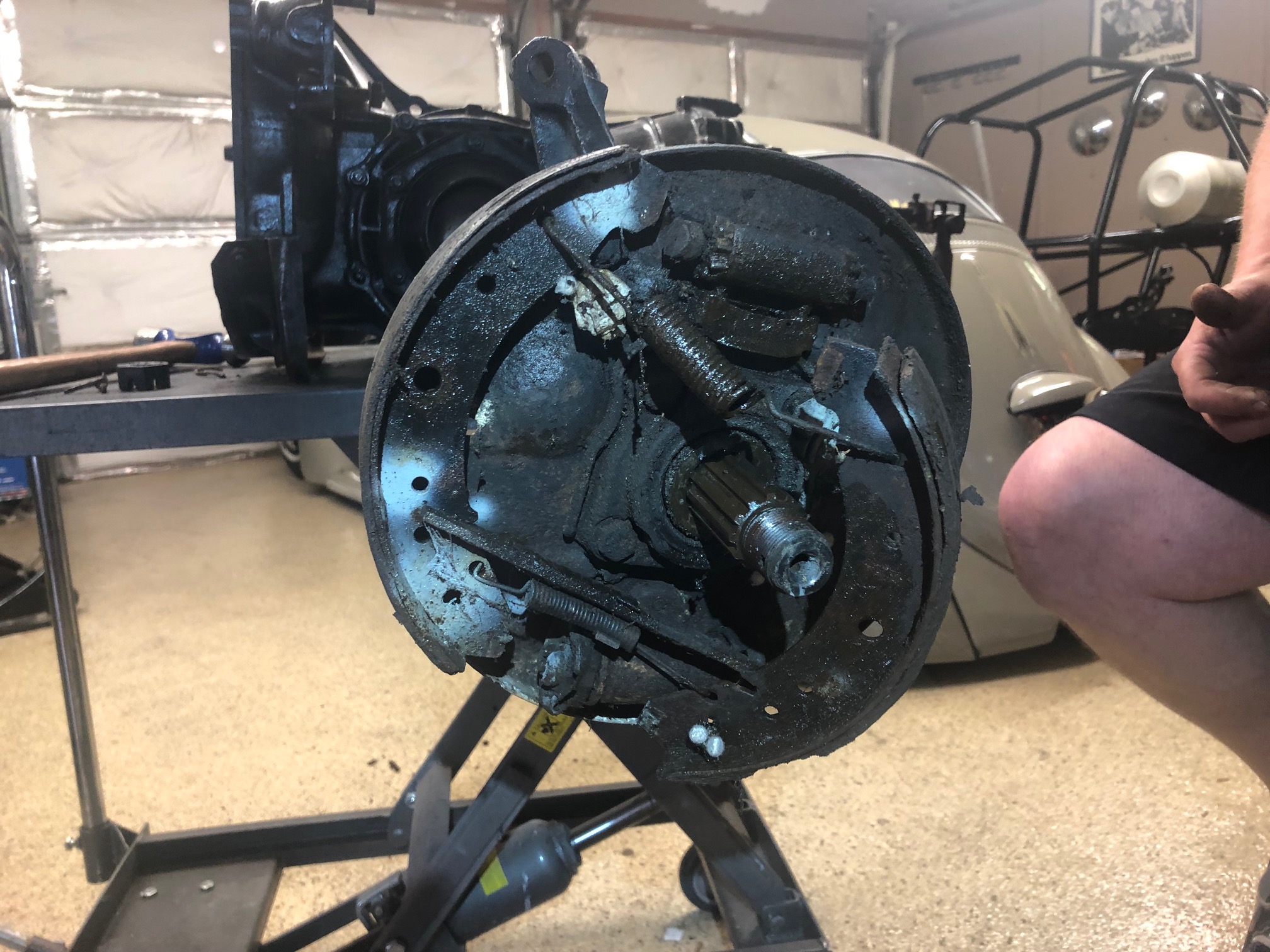It took forever to get this one hub off. Pretty much everything is seized. Backing plates are missing the adjuster tabs. But the trans is apart