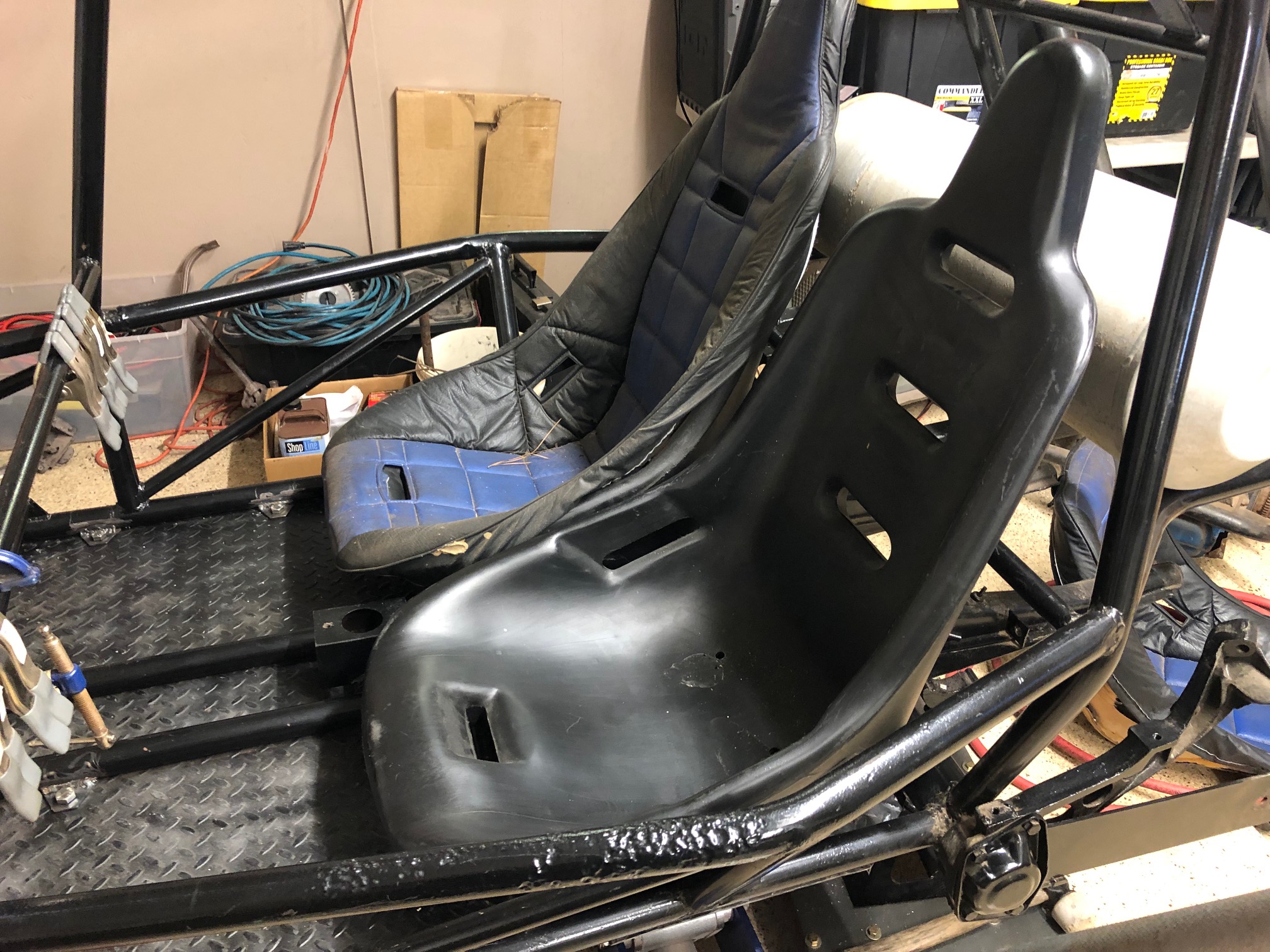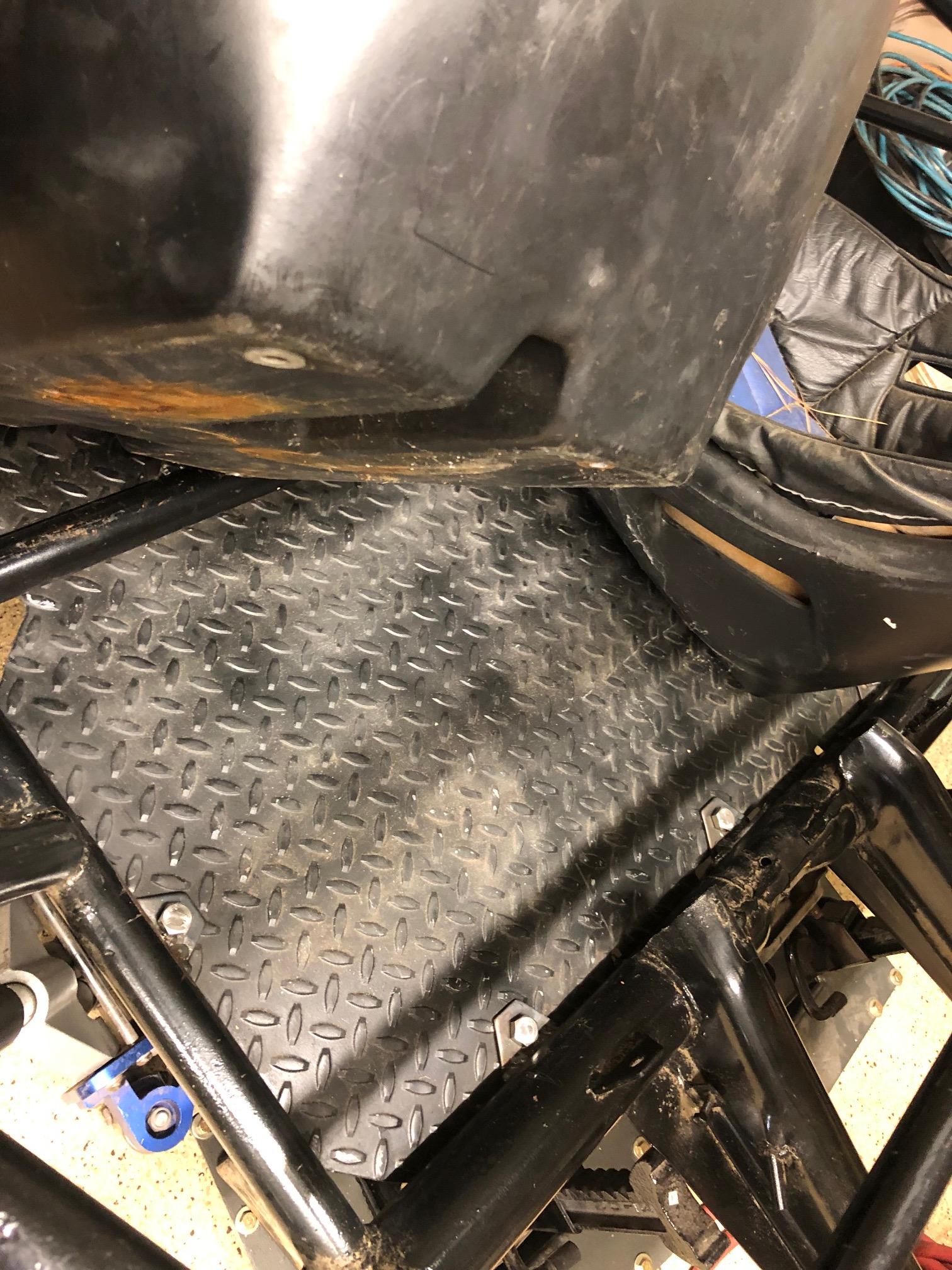 The seats are proving to be challenge, my plan is to hard mount the passenger seat, but add a slider to the driver seat. I really do not think this rail was ever built. A couple of things lead me to believe this. The floor came with the rail but was never installed, no tabs and no signs of a previous floor welded in. Also no tubes for the clutch or accelerator cables, yet it has brackets welded in for the pedal assembly and brake master cylinder. Those brackets are so far away that when I sit in the seat the pedal assembly is about a foot away. Also there is nothing on the cross bar for a steering shaft. I am guessing this could have been clamped on though. I do not see any signs that seats have ever been installed. So who knows.